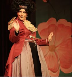 It is a clever story and this production, directed by Molly Walker, is great fun, with lots of bright ideas. These include a colourful alternative for scene changes – instead of curtain down or a darkened stage with figures in black scuttling to move sets and props, there is a chorus with colourful parasols of all sizes which are opened and closed in sequence, quite distracting the audience’s attention to what is going on behind.