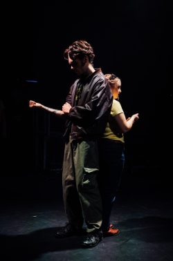 Three actors shared the central roles, with Ifeoluwa Aromona, Ethan Wilson and Joe Napier as Orpheus and Eve Harris, Catie Ironmonger and Aoife Scott Whitehouse as Eurydice, telling the story of their meeting, their intense love and their fate-decreed inevitable parting. But, as the narrator explained, we were looking at the story from Eurydice’s standpoint.