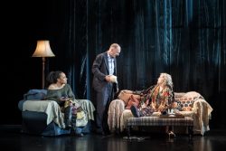 Larry (Fiennes) is a famous chat show host, and, like anyone who has reached their late 50s, has some history. Part of his history is a 20-years-younger actress, Marianne (Rosalind Eleazar from Slow Horses). He also has a mother Athena (Francesca Annis) with a past of alcohol, drugs, careless cruelty, sex and sectioning, and a twin brother Richard, who lives a hermit’s life in the peaceful countryside. Rachel Tucker plays everyone else, and sings and tap dances, too.
