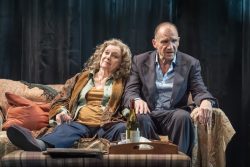 Larry goes to an ATM where he is mugged and stabbed. One interpretation of Small Hotel is that the rest of the 90 minutes of the play is spent in the fringes and supernovae of his mind as he loses the battle for life. Ralph Fiennes’ programme notes say that it “explores the fragility of relationships in a modern world of societal impulsiveness and ambition, a world where intimacy and love struggle to cohere.” It can be both, or either, or something else altogether.